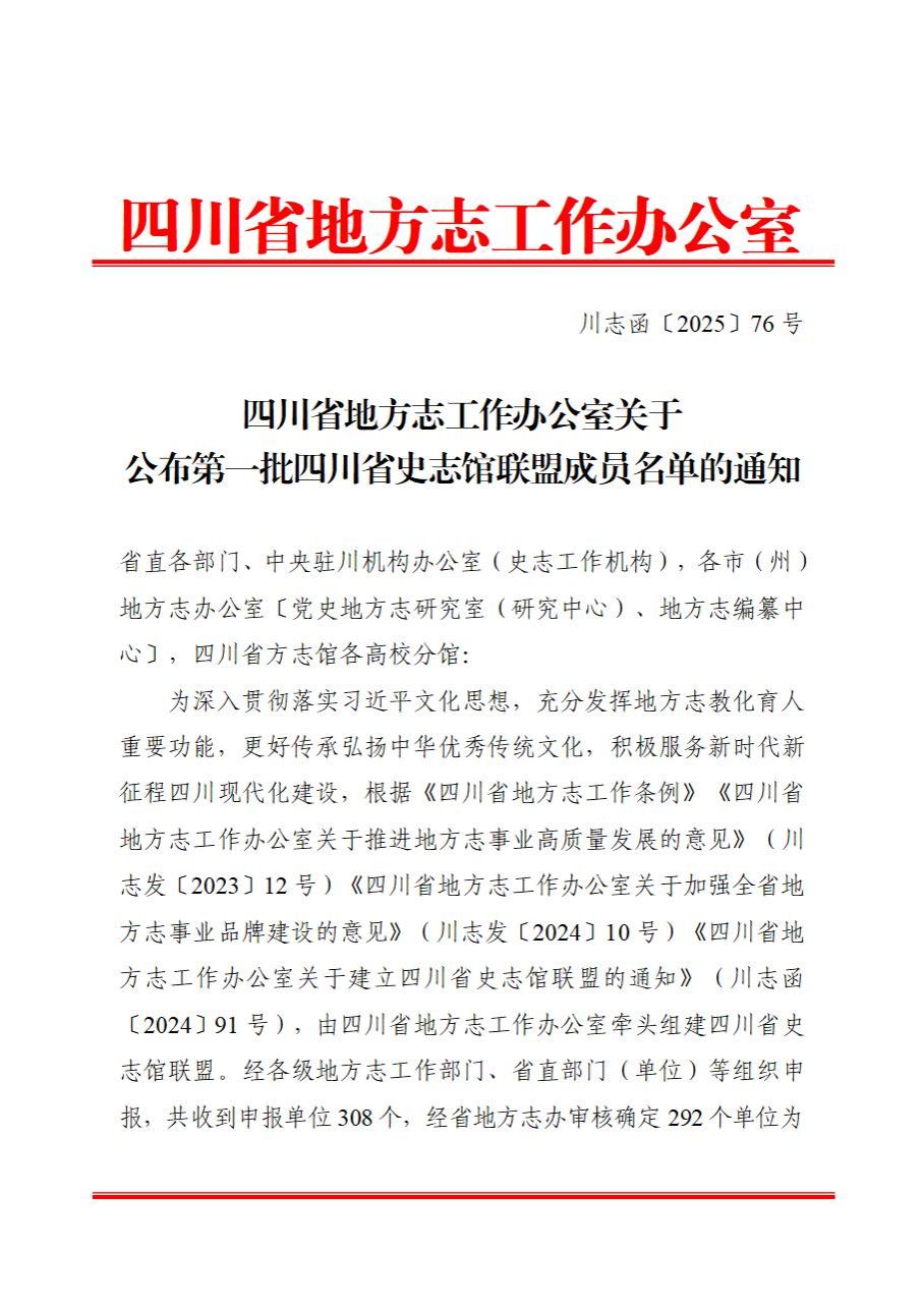 近日,四川省地方志工作办公室正式印发《关于公布第一批四川省史志馆联盟成员名单的通知》(川志函〔2025〕76 号),内江师范学院凭借深厚的文化底蕴与扎实的史志工作基础,成功入选第一批四川省史志馆联盟成员单位。