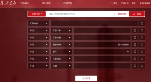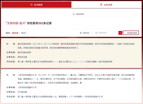 《复兴文库》检索范围包括文章内容、文章标题、文章作者、发表时间、事件、文章出处、主题,并支持在已有检索结果中进行二次查询,缩小结果范围进而获取目标文献。